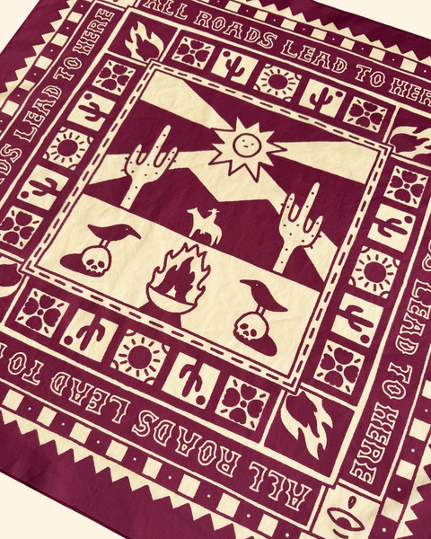 Limited edition cotton bandana featuring ‘All Roads Lead To Here ’ illustration.