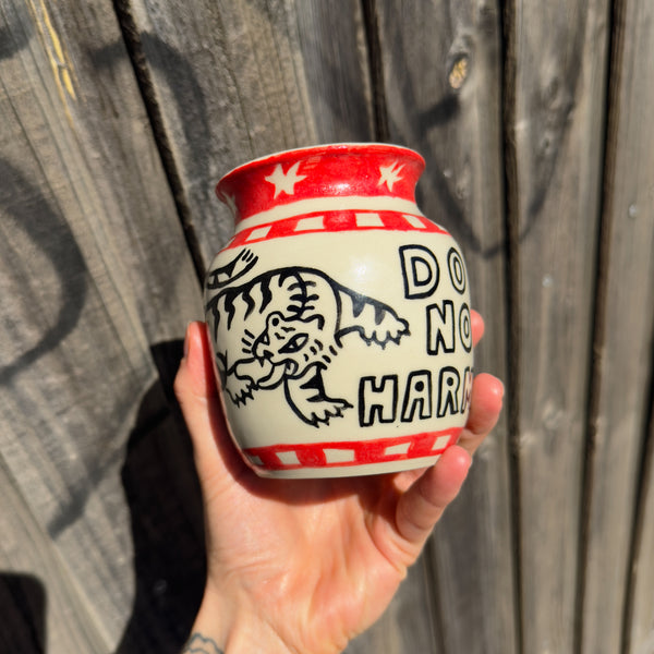One of a kind hand thrown, hand painted small vase in porcelain featuring Do No Harm, Take No Shit illustration.