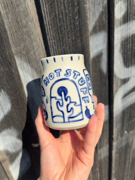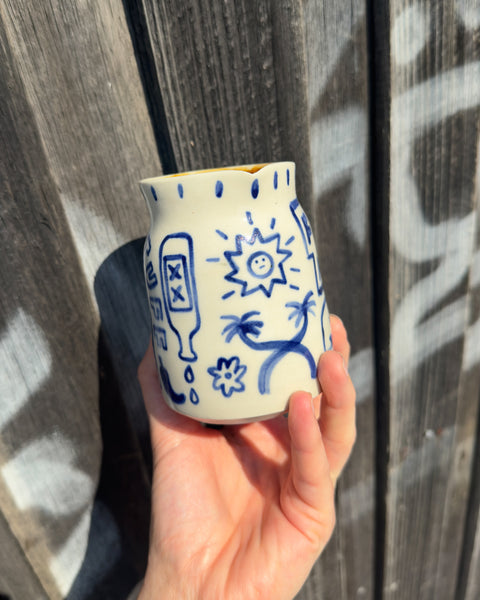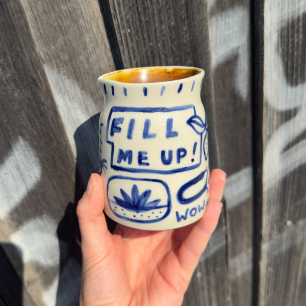 One of a kind hand thrown, hand painted small jug in porcelain featuring Fill Me Up! illustration.